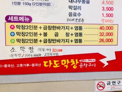 マッチャン2人分+コプチャン+ハツで26,000ウォン。残念ながら少し残しましたが、堪能しました。生のマッチャン(豚の大腸の最後の部分(直腸)のこと)は最高でした。- 旅行時期