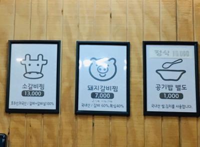 名物のカルビチムは13,000ウォン、デジカルビチム7,000ウォン、ライスが1,000ウォンでした。迷わず、カルビチムを注文しました。