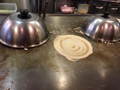 たっぷりのキャベツを蓋で蒸し焼きにし、隣で生地やそばを別々に焼き、最後に3つを合わせます。