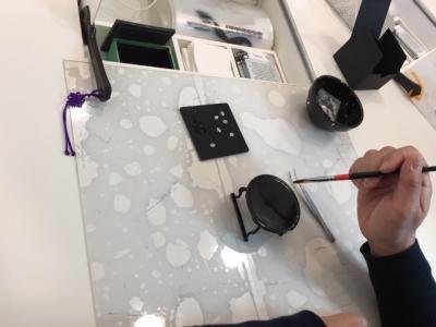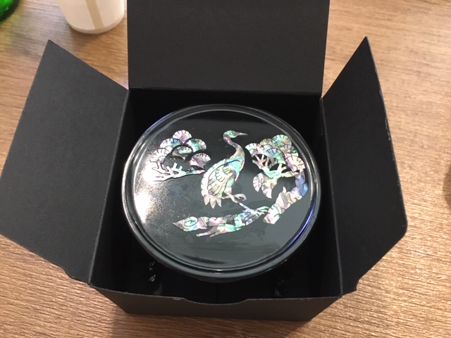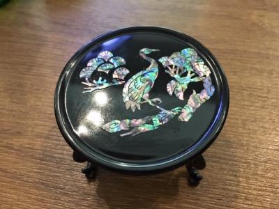 伝統工芸品作りは定期的に内容が変わり、この日は螺鈿細工のミニチュア座卓つくりでした。