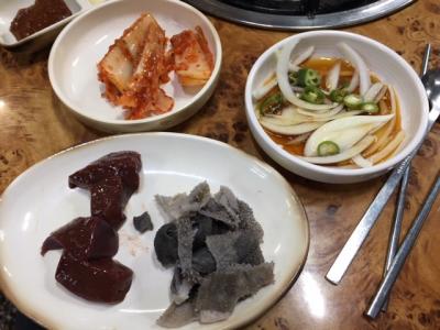 チョッパル盛合せ(小)27000ウォンを注文しました。チョッパルを巻いて食べる野菜や、オキアミも塩辛、一緒に巻いてもいいニンニクやキムチ、豚の腸詰=スンデ、スンデのスープ(スンデクッ)などがまず並びます。