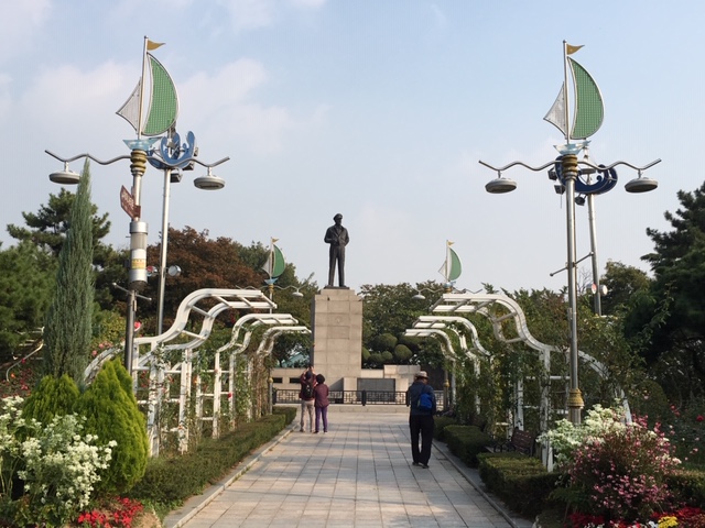 仁川自由公園の中央付近の小山の頂上がには広場があって、インチョン港を望む眺望が抜群です。この広場の端には、朝鮮戦争で活躍したマッカーサー将軍の銅像があり、その前方にはバラ園が整備されています。