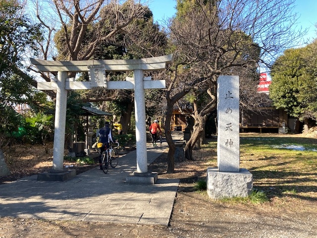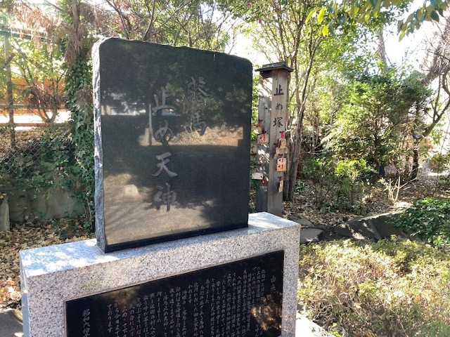 徳川八代将軍吉宗の乗る馬が暴走しあわや落馬というときに、将軍の落馬を止めたのがこの天神様の御加護だといういわれがあり、「止め天神」とか「落馬止め天神」の別名があります。小さなひっそりとした神社です。