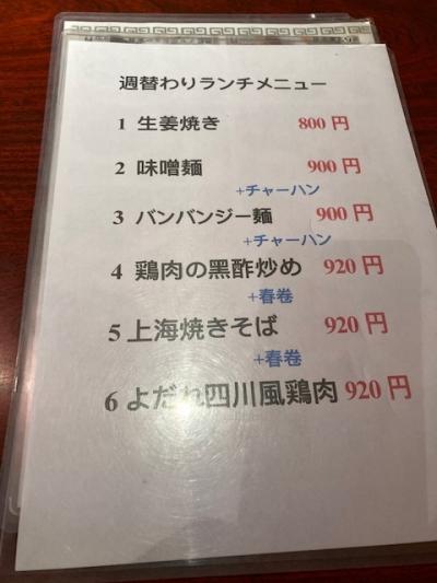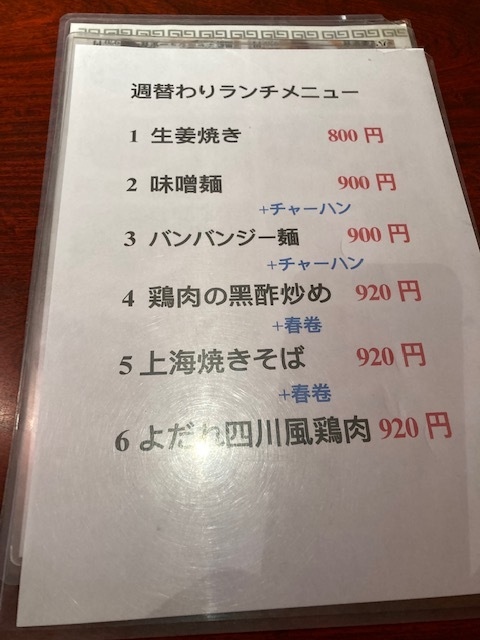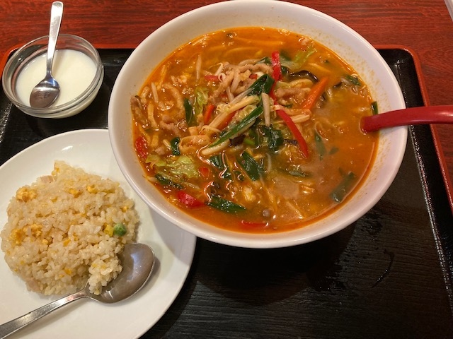 週替わりのランチメニューが6種類ありました。そのうち、味噌麺(半炒飯付)をいただきました。麺は見た目ほど辛くはなくて、ちょっと予想外でしたが味はまずまずでした。