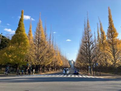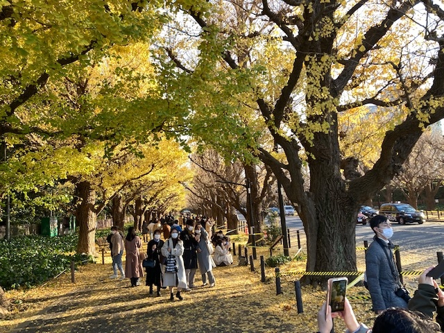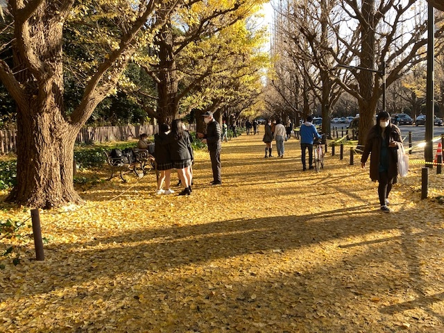 外苑絵画館前から国道246に延びる銀杏並木は明治神宮公園の有名な観光名所ですが、なかなかその紅葉のベストな時期に見に行けたことがありません。最近はドンドン紅葉が遅くなり、12月の中頃という年もあるほどです。今年は12月9日に行きましたが、ほぼ終わってしまい今年も残念な結果でした。でも、少しばかりの銀杏を見に大勢の観光客が来ていました。