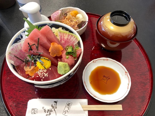 ソレイユの丘から程近いのですが、三浦市に入ったところにあります。隣には、慶事・法事などで利用できる「日本料理 慈こう」があり、なんとそれっぽい料理でした。定番の定食類に加え、金田漁港朝獲れの黄金鯵がお勧めです。これは、マアジですが、回遊性のマアジは黒っぽいのに対して、回遊せず根に着いたマアジは金色にを帯びて光るといいます。アジフライでいただきましたが絶品でした。