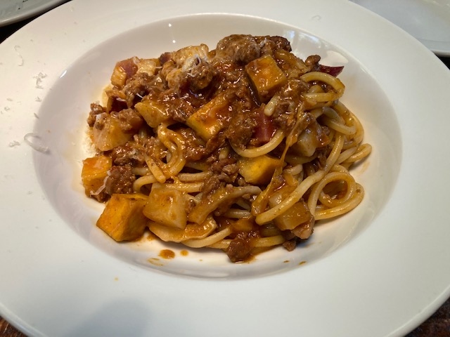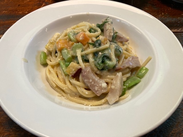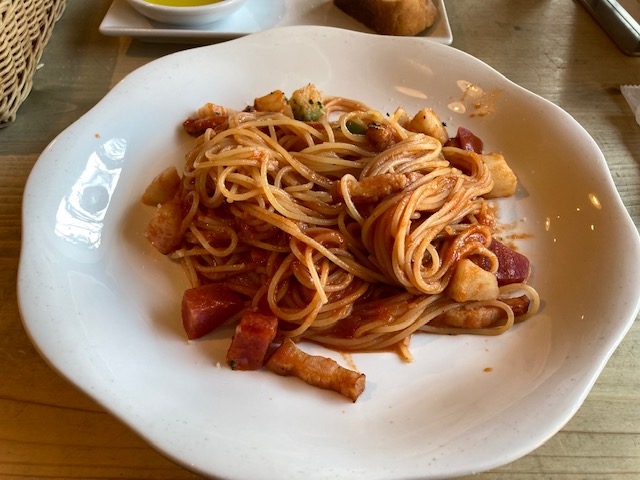 ランチには、スープが付きます。また、フォカッチャかライスを選ぶことができ、お替わり自由です。私は、パスタランチA(1,380円)。(パスタは2種類から1種を選ぶことが出来ます)家内は「神奈川産やまゆり豚ロース肉のステーキランチ」(1,380円)。(バルサミコ酢が効いた美味しいソースでした)。食後にはドリンクも付きます。