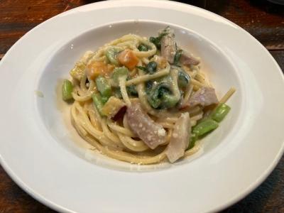 寒川神社参拝後、スマートフォンのマップ検索機能で調べて初来店です。全く知りませんでしたが大人気スポットらしく、約15組・1時間待ちでした。築450年の古民家をリノベーションされた建物で雰囲気いいです。料理は夫婦でパスタを一皿ずつ注文し、ピザを一枚シェアしました。パスタも美味いですが、ピザ(マルゲリータ)は絶品でした。車でしたのでノンアルコールビールでしたが美味しいランチを楽しめました。