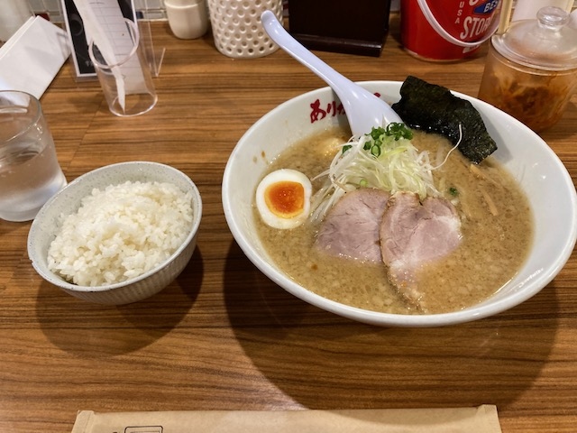 あっさりとはいえ背脂有り。結構なこってり具合。煮卵半個、ネギ・もやし、メンマ、海苔のトッピング。美味しいラーメンでした。少し塩辛い(塩っぱい)かな。
