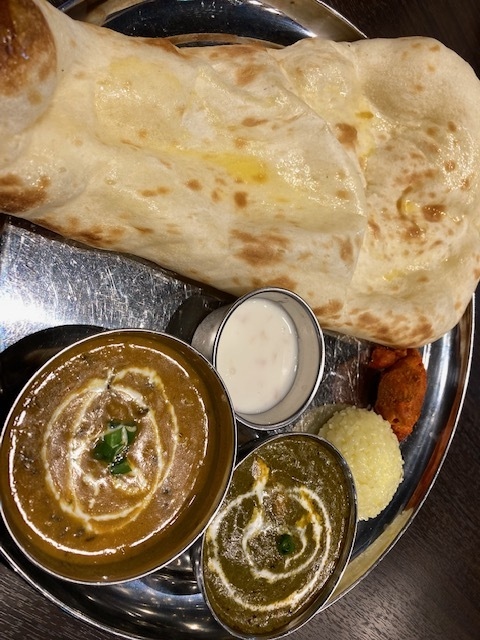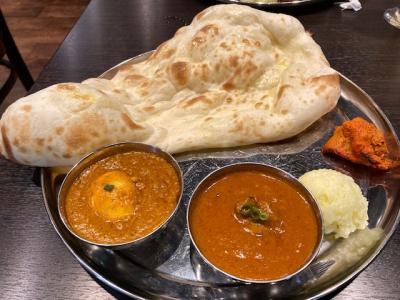 家内はレディースセット、私はシェフのお勧めセットを注文。2種類のカレーを選べて、ナン・ライス・サラダ・小さいタンドリーチキンが付いています。ナンはお代り自由。