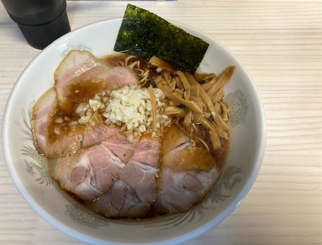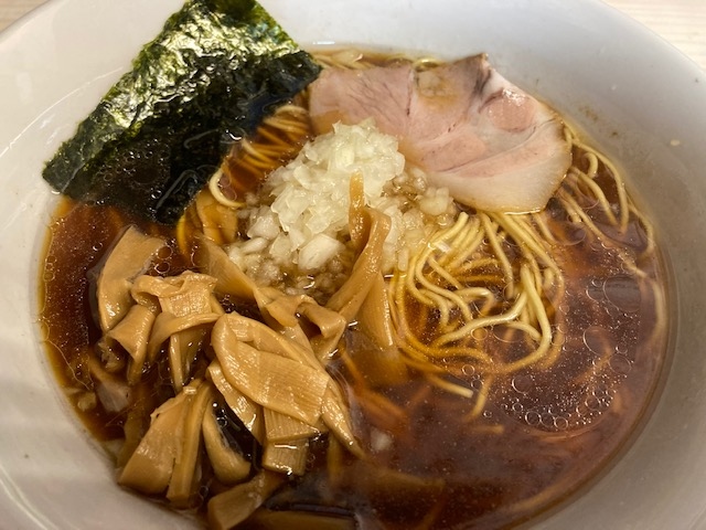 しょうゆ味の澄んだスープは豚骨と魚介から取っていて、北海道産の刻み玉ねぎが乗っています。