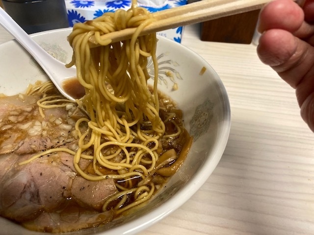 トッピングは、チャーシュー、しなちく、のり、刻みネギ。麺は、やや黄色い中細縮れ麺。ラードが効いて甘みも感じます。見た目はかなり色が濃く塩辛いかと思いましたが思った以上にあっさりでした。