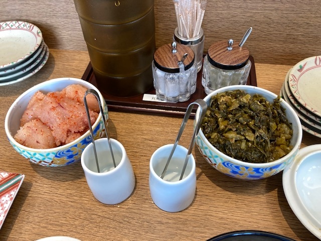 「魚天定食(1300円)」を注文。卓上にある、やまやの辛子明太子・からし高菜のおかわり自由です。- 旅行時期