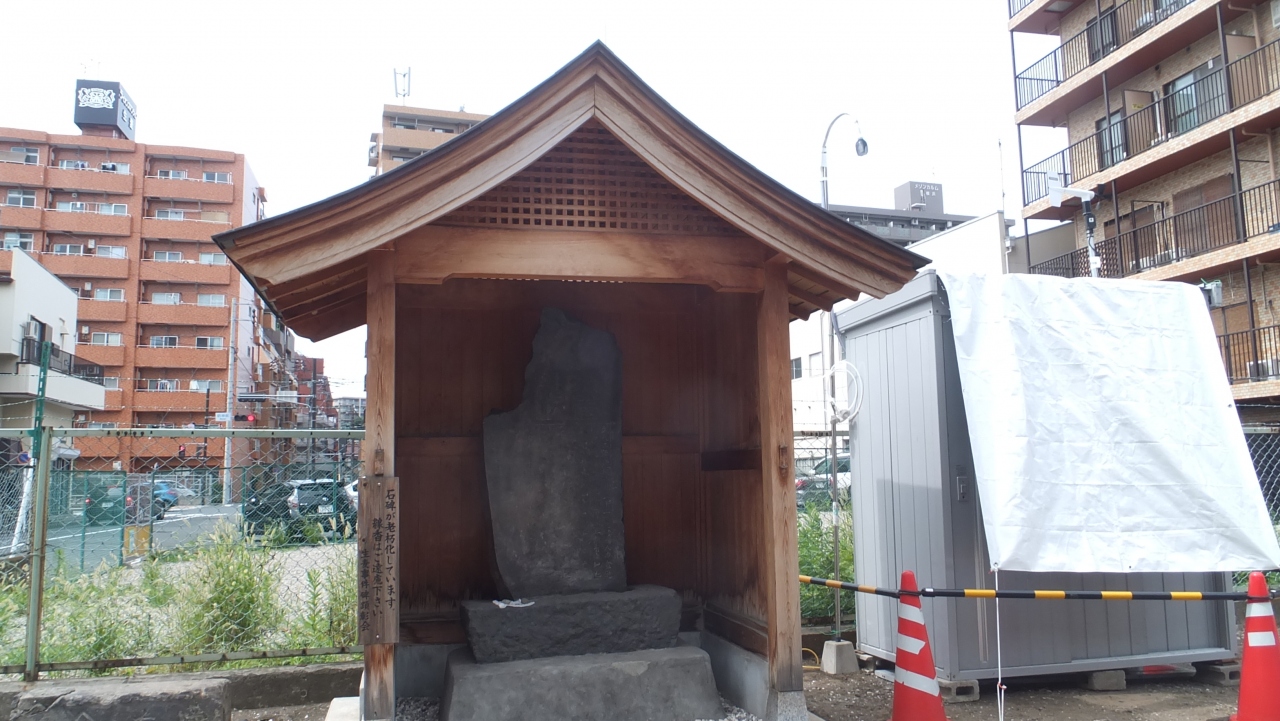 「横浜環状北線」の工事の影響で、碑は平成28年末までここに仮移設中です。