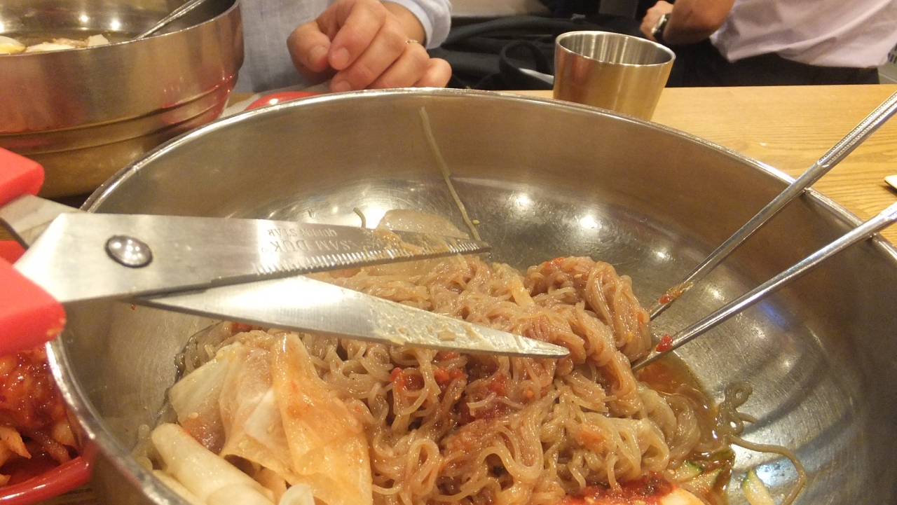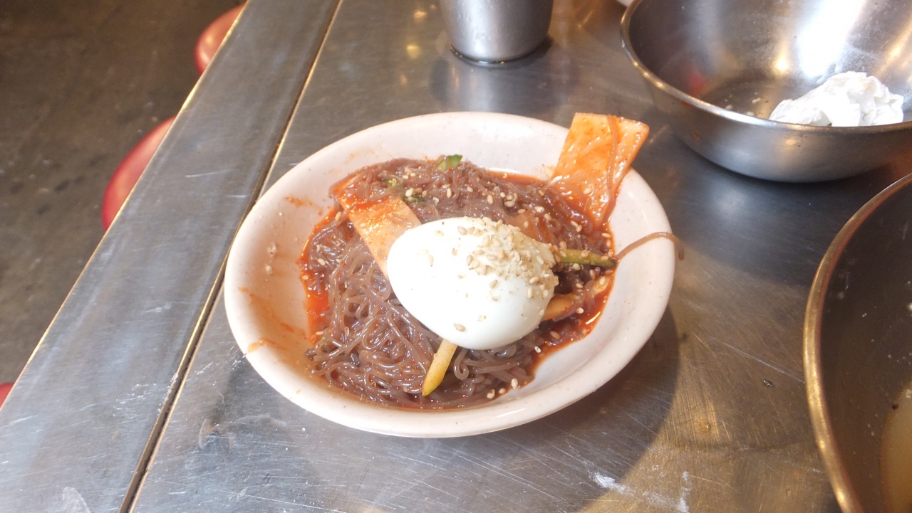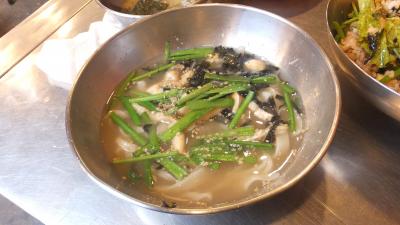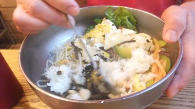 「カルグッス(韓国風手打ちうどん)」を注文してみましたが、「暑いのでビビンバにしなさい。うどんはサービス、サービス(笑)」。