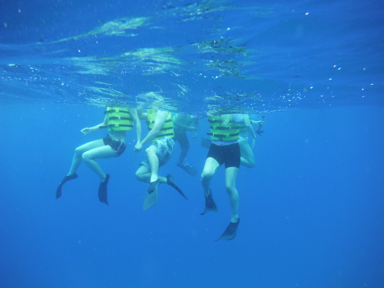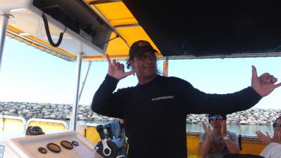 ここから約2時間のクルージングで、イルカを見つけると、シュノーケルセットをつけてボートから海にドロップ!