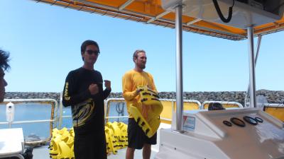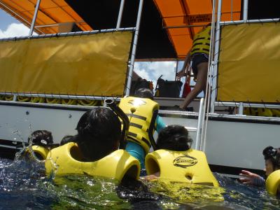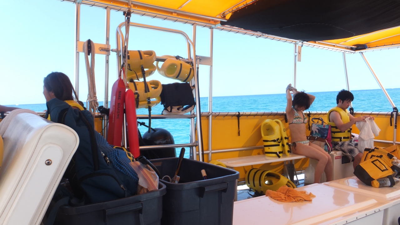 ボートは大きく安定感あってあまり揺れませんが、心配な方は「船酔い留め」を飲む方が安心です。救命道具、フィン、シュノーケルとも新調されていて、気持ちいいです。