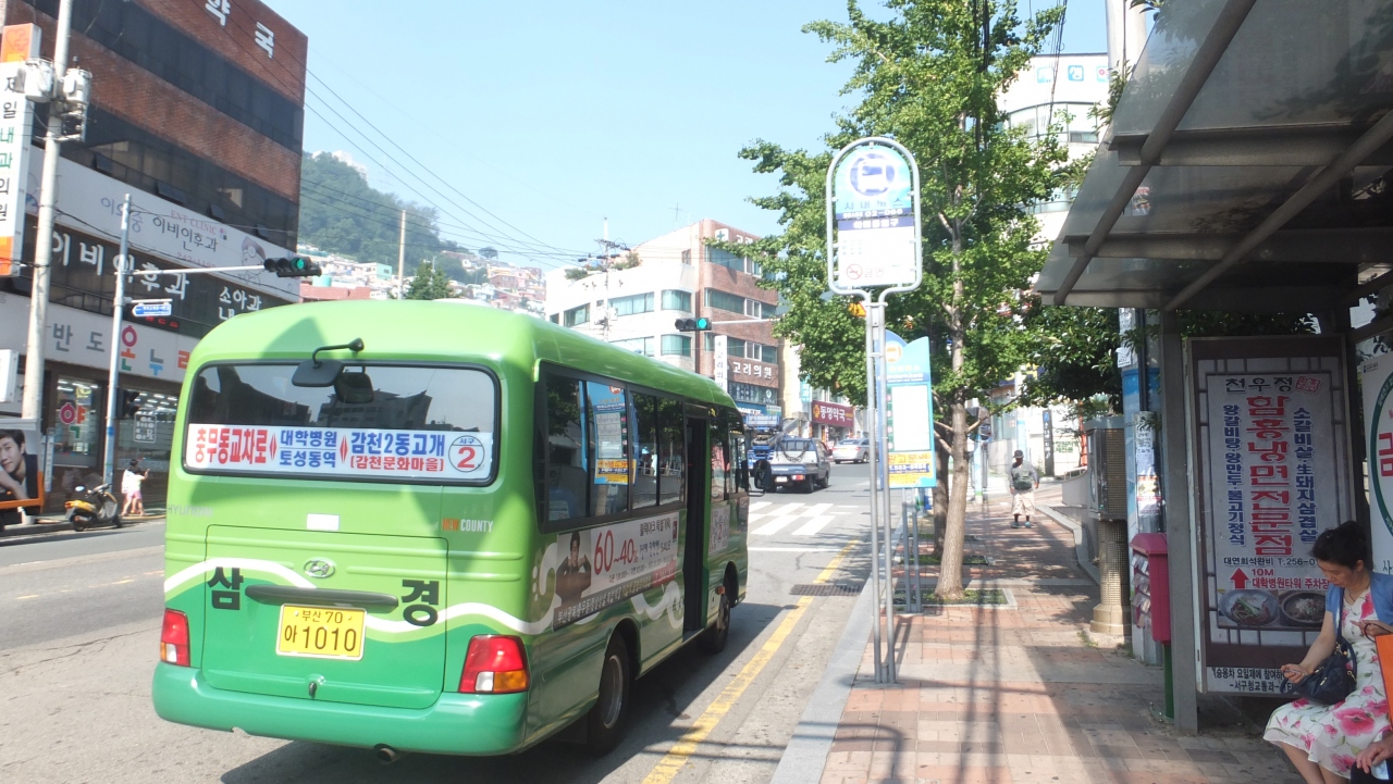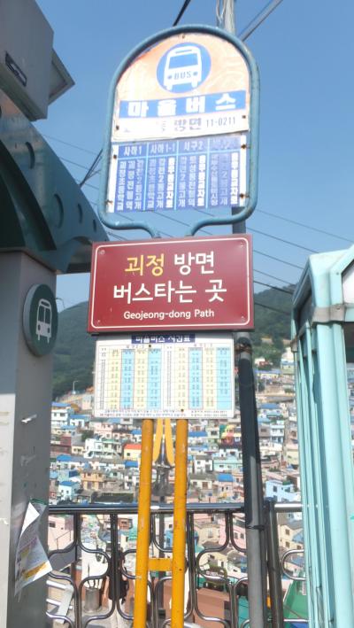 プサン地下鉄の「土城」駅で降りて、「釜山大学病院(プサンデハッビョンウォン)」停留所から乗りました。「甘川洞文化村」へは、1−1番、2番、2−2番に乗ればOK。