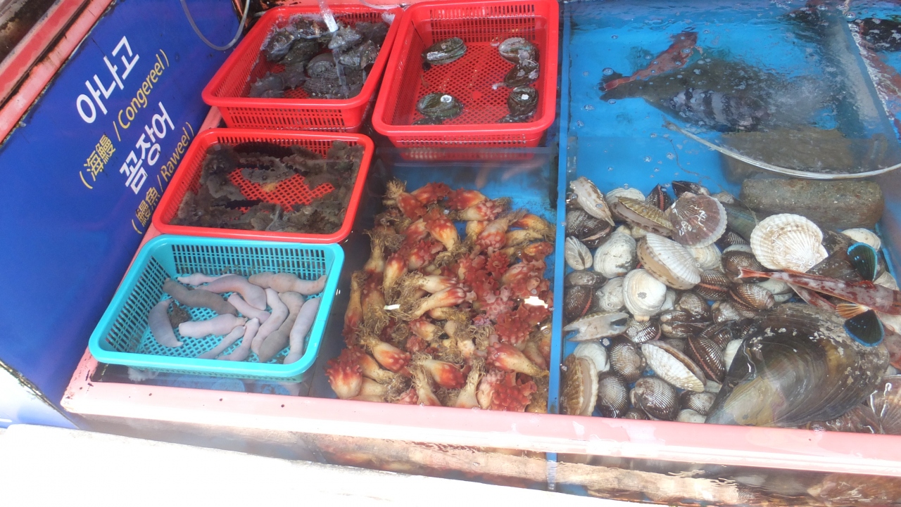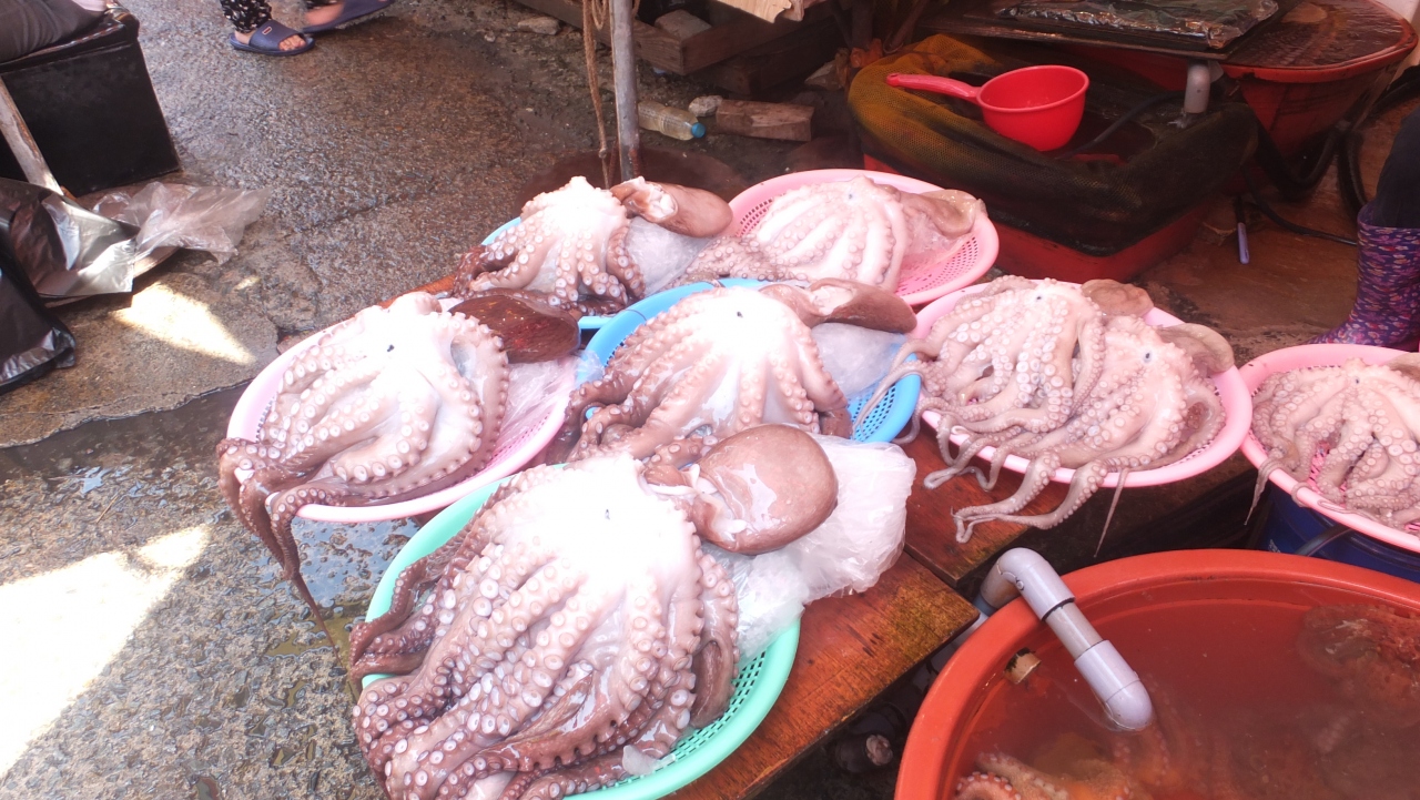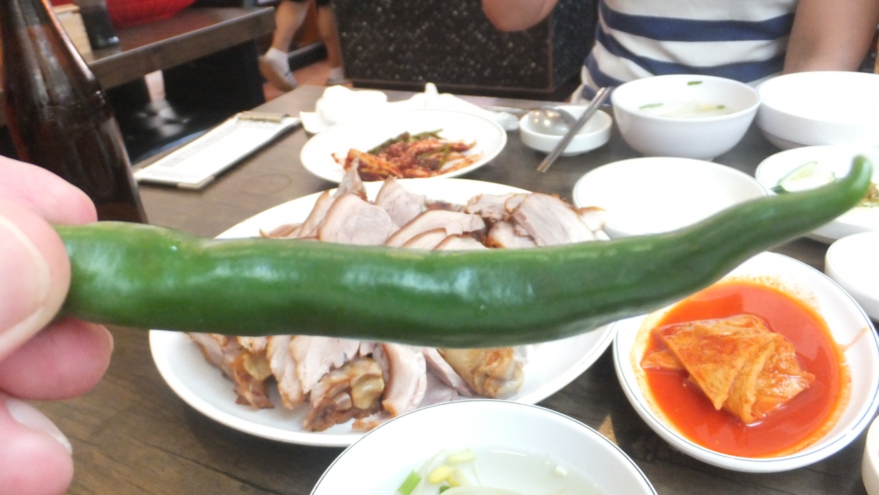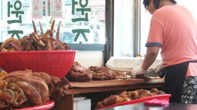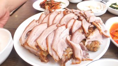 日本の豚足というと指の部分だけですが、韓国では脛から下の部分がデーンと出されます。