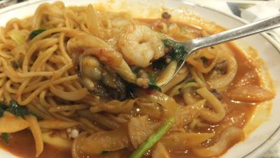 家内は、少し辛い海鮮そば(汁なし)を注文。