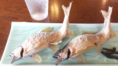 鮎塩焼き2本・鮎魚でん1本・鮎フライ1本・鮎の酢のもの・鮎こくの鮎三昧でした。