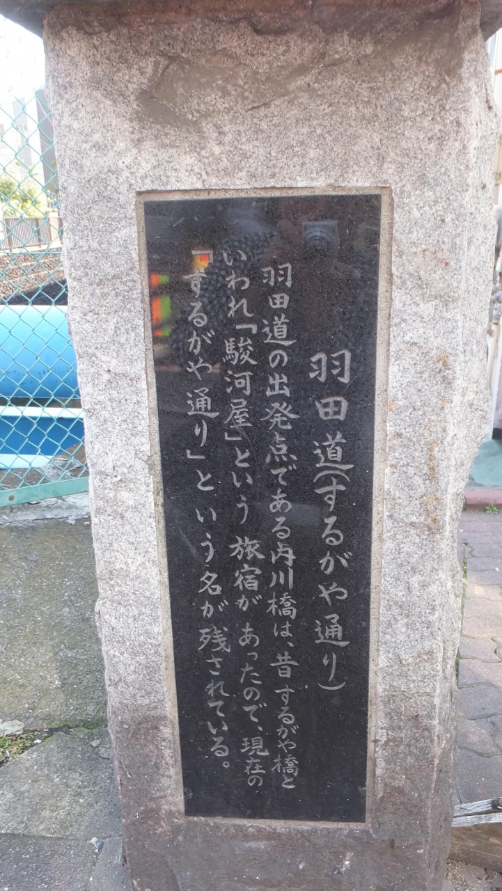 旧東海道の「美原通りの商店街」を多摩川方面に進むと、「内川」という小さい川にぶつかります。ここにある橋が「内川橋」ですが、江戸時代ここが多摩川に掛かる「羽田の渡し」に向かう羽田道の出発点であったらしい。