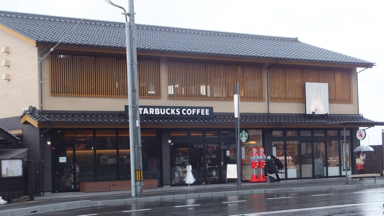 出雲大社の正面にある「二の鳥居」前に、「ご縁横丁」というのがありますがその横の方に、出雲大社の景観に合わせたかのような和風の作りをしたスタバ。