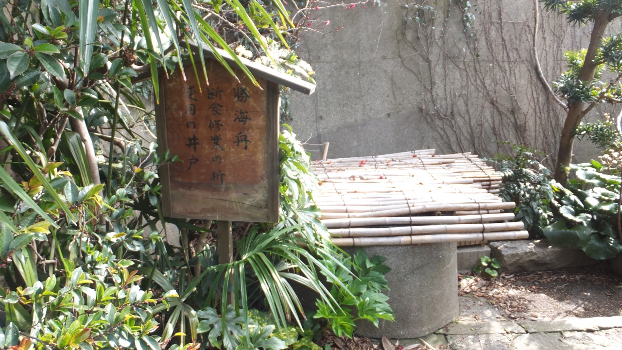 社務所の裏にある井戸がありますが、勝海舟が咸臨丸での太平洋横断前に、この井戸で水垢離(みずごり)をした後、この神社裏山(明神山)の山頂で断食をしたと伝えられています。