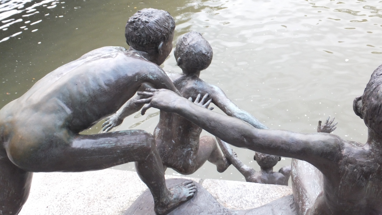 5人の裸の男の子たちが川で泳ごうと橋から飛び降りる瞬間を描いた、彫刻です。