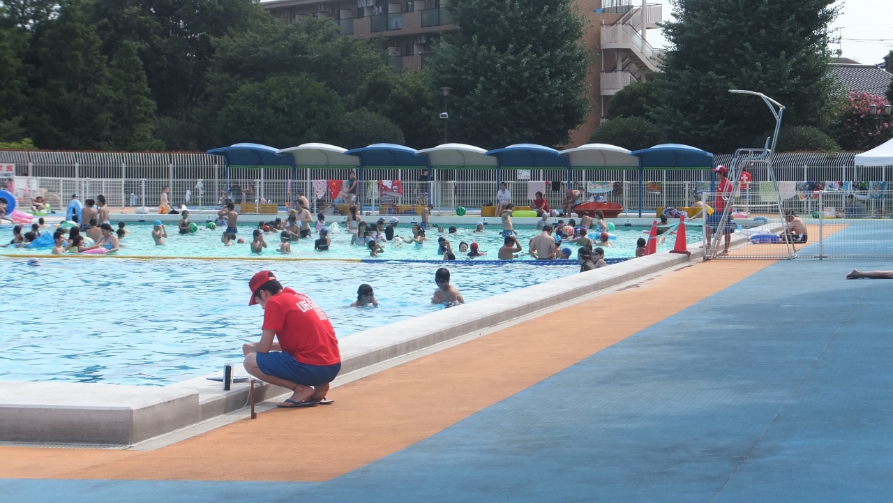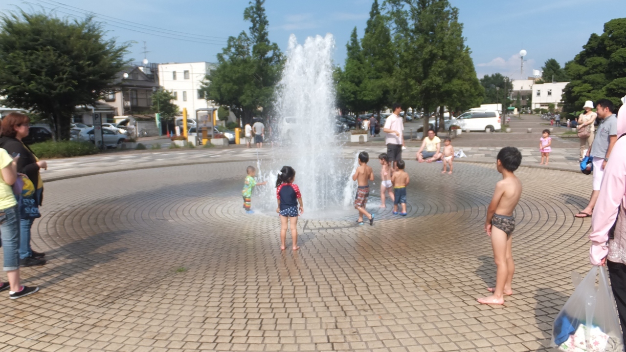 7月~8月はプールも開放。人工せせらぎでは子供達が水と遊ぶ。
