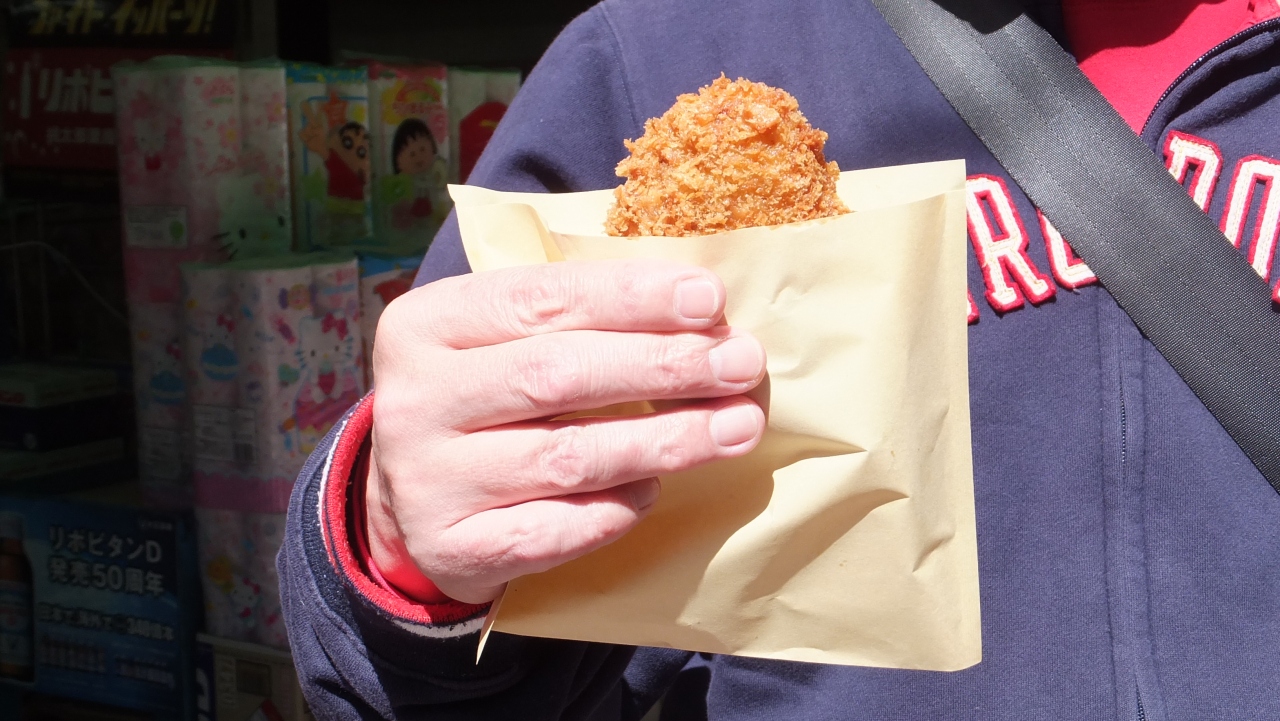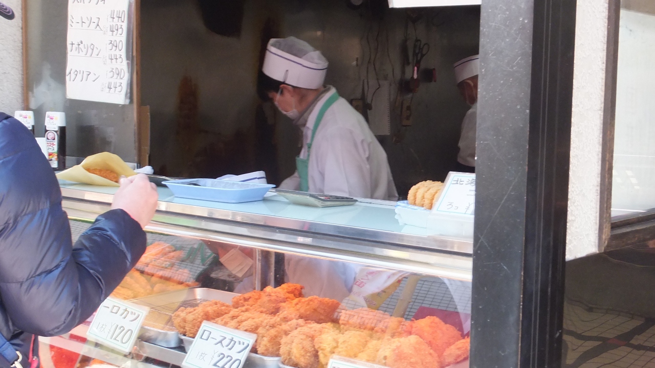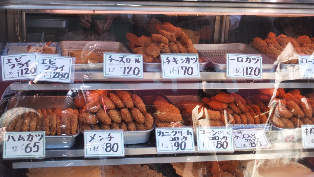 列の合間をみて、メンチカツ80円、カニクリームコロッケ90円を買いました。
