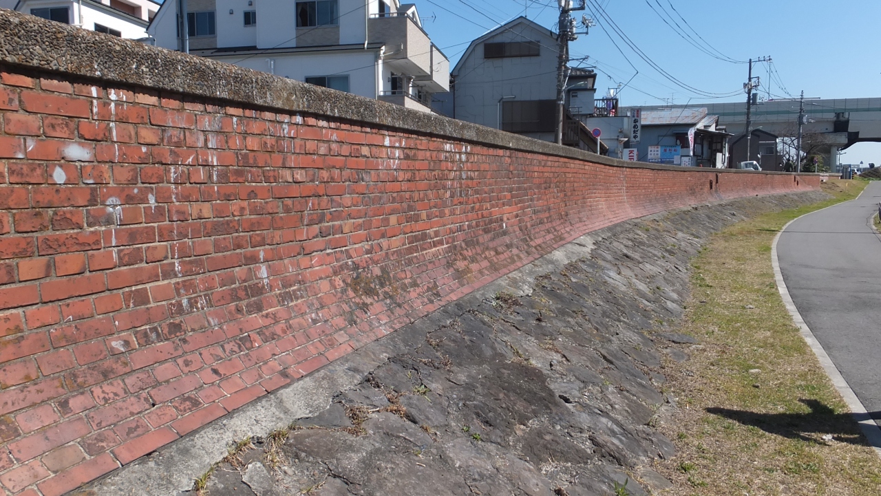 多摩川の河口から2km程さかのぼった辺りから大師橋のたもとまで、現在の堤防より1本奥の道路ぞいにレンガ堤が続きます。