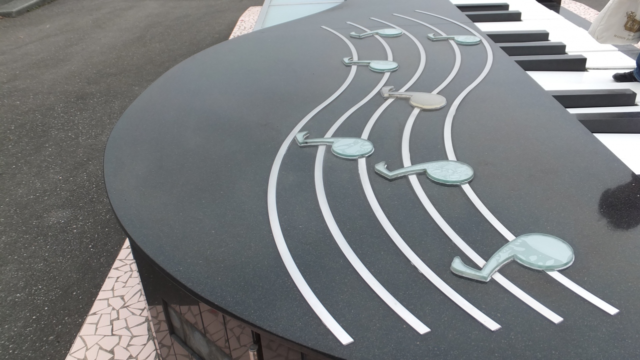 広場には大きなピアノの鍵盤が据えられています。入り口には赤外線の感知装置がセットされていて、人が入ると同時にテレサの名曲の数々が流れます。