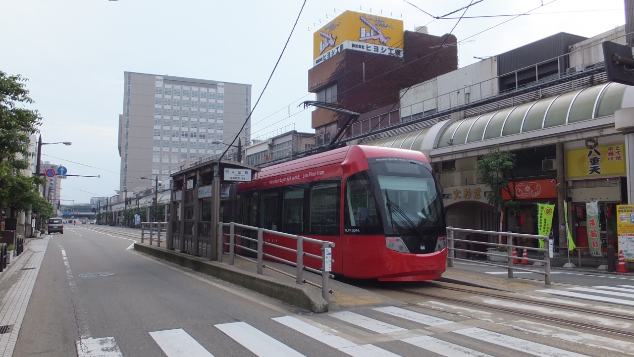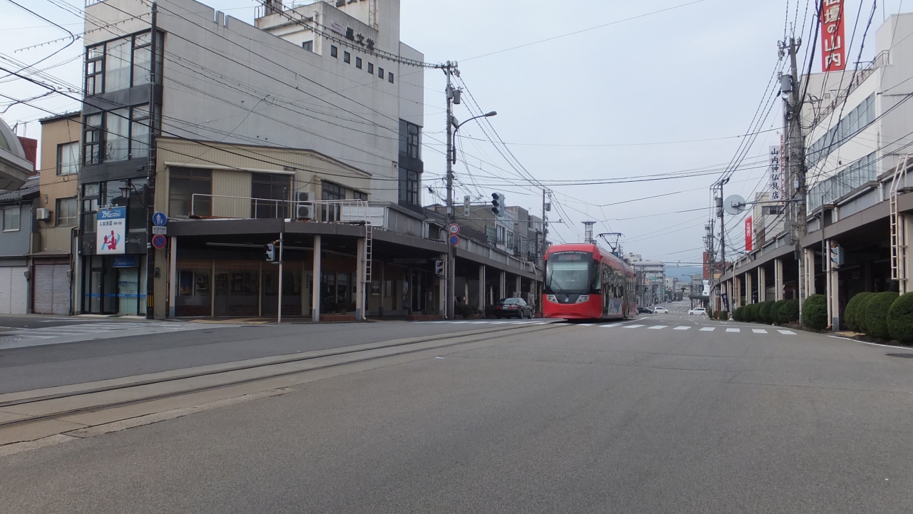 お洒落な路面電車の電停(停留所)。高岡駅や土蔵造りの町並みに程近いです。