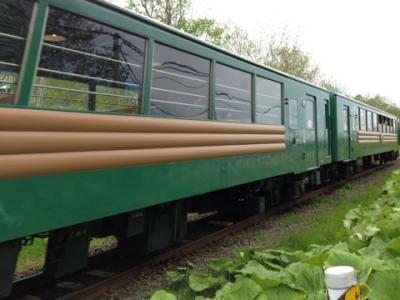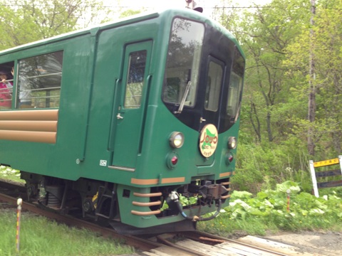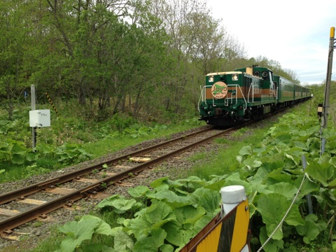 写真でも撮ろうと停めたところ、ちょうど踏切がカンカンとなりはじめ、ノロッコ号が来ればいいなぁ・・・、と思っていたら、運よくノロッコ号が来たという訳です。
