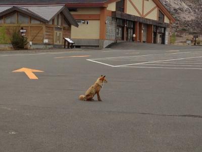 なんとここの駐車場入口で、「キタキツネ」に遭遇しました。