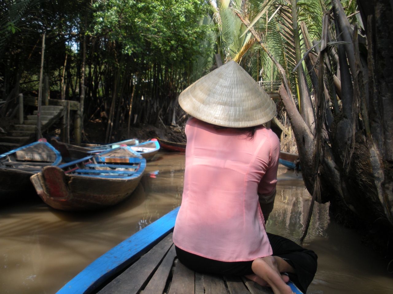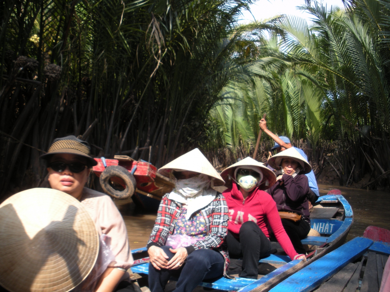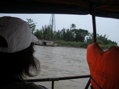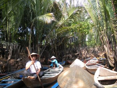 その後、迷路のように張り巡らされたメコンの支流へおばちゃん船頭の漕ぐ小さい船で出発。両岸にある椰子の葉や熱帯の木々は見ものです。