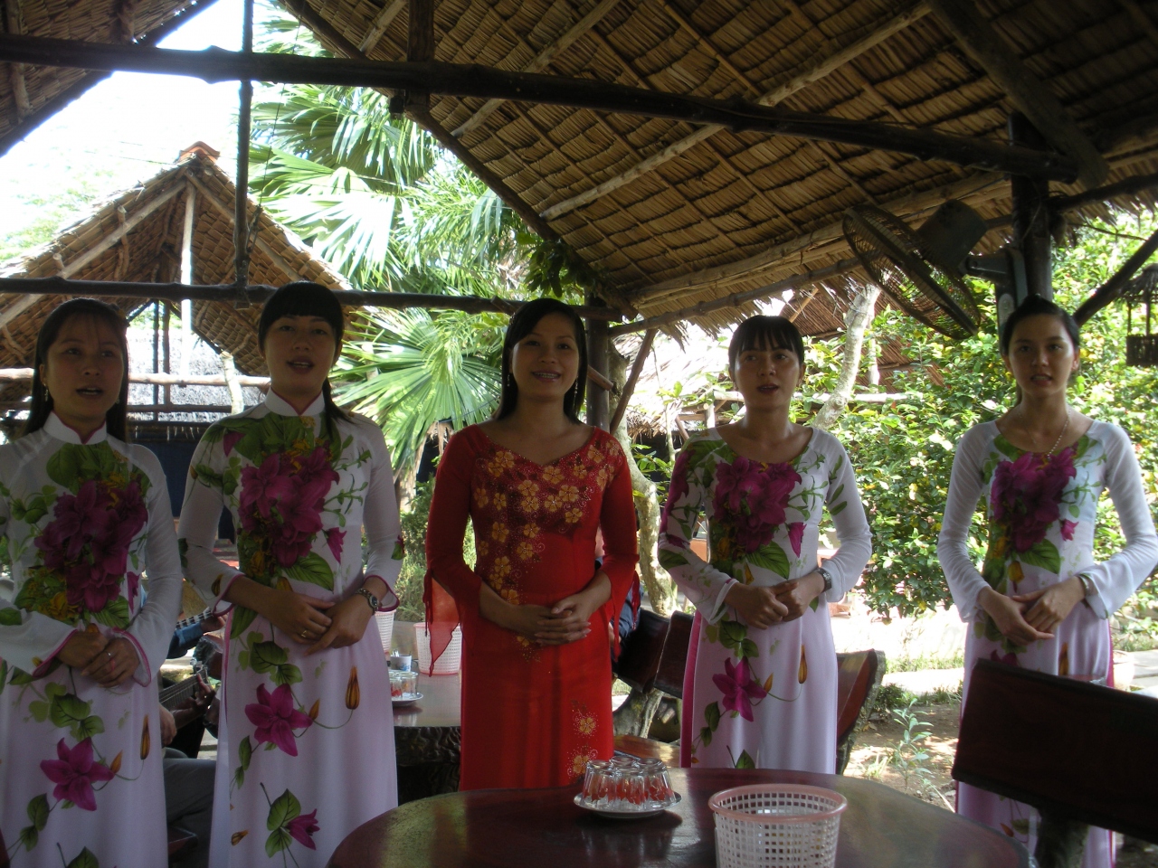 ココナッツ飴の製造やミツバチと蜂蜜などのおみやげ屋見学、お茶(笹の葉)の接待やフルーツを振舞われ、そこに「歌の歓迎」があります。女性5人にギターなどを弾く男性3人が4曲ほどうたってくれます。こちらは夫婦二人なのでこれらのアクティビティがきつい。多人数なら相手の攻撃?もかわしようがありますが、逃げられない。