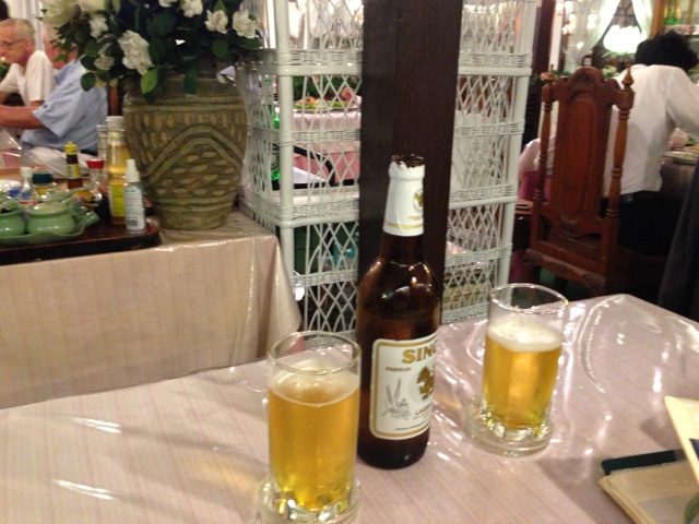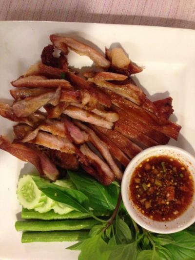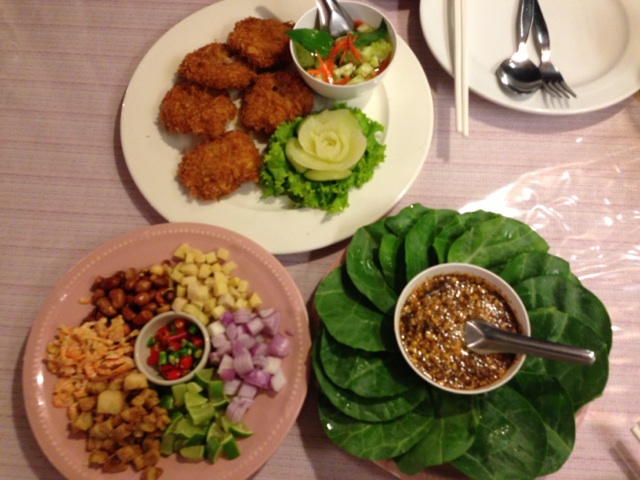 「豚の首肉の炙り」、「アミの混ぜチャーハン」、「(よくわからない)野菜でピーナッツや干し海老などを包んで食べるサラダ」「海老のタイ風さつま揚げ」「デザート」「シンハービール大瓶2本」夫婦二人で1320B(4200円程度)と格安です。