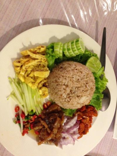 店員ベテランの女性と若い女の子ですが、いずれもキビキビとしています。日本語は通じませんが、大半のメニューには日本語の説明が添えられています。例えば、「甘辛い~~の炒め」と言った具合です。メニューは豊富です。魚類はやや高い(600Bぐらいする「まなかつおの料理もありました)ですが、サラダ類から肉、海老、鶏いずれも安く大体が一品180B位。