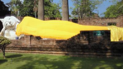 バンコク市内のるワット・ポーの涅槃像は巨大で黄金色ですが、こちらはそれほど大きくなく表面は漆喰加工の様子で割合地味です。ツアーガイドさんによりますと、もともとは金箔が張られていたが、後にビルマ(ミヤンマー)軍に剥がされた、とのことです。