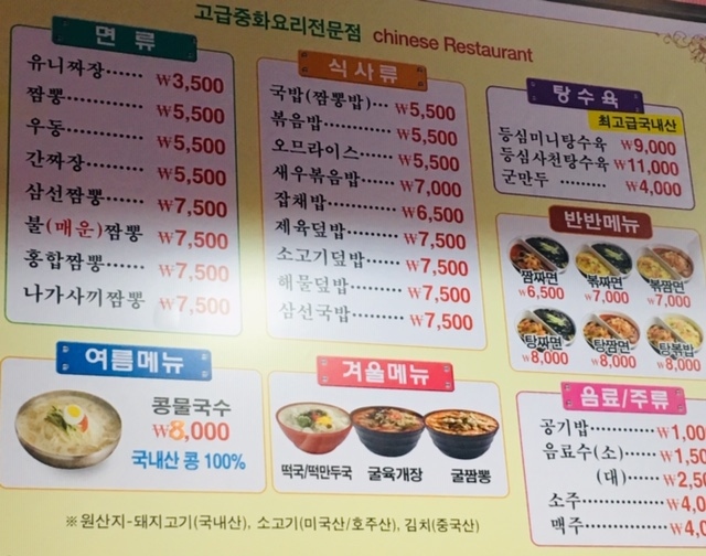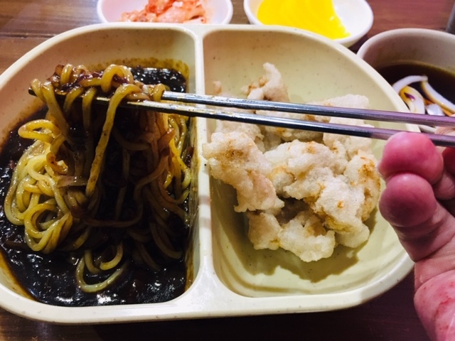 メニューはクッパ、チャンポン、ウドン、炒飯(ポックンパッ)など一通りある感じで、値段も安い。チャジャンミョン(韓国式ジャージャー麺)と豚の天ぷらのセットを注文。美味しかったです。- 旅行時期
