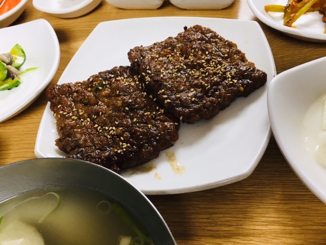 トッカルビとは、粗めに刻んだカルビをミンチ状にして丸め、濃い目のタレとともに炭火焼きにしたもので、いわば韓国式ハンバーグ。ミンチと言っても、肉を叩いているので、粒がしっかりしていて歯ごたえも良い。ニンニクなどが効きもっとスパイシーです。薬味と一緒に葉っぱに包んでいただきます。美味しいです。
