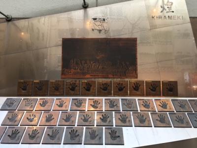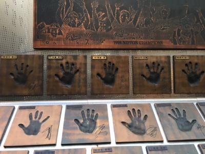 権藤博監督の胴上げシーンの銅板レリーフを中心に、優勝メンバー全員のブロンズ製手形が並び、横浜スタジアムに向かって打席に立つ石井琢朗選手会長の足形が床に埋め込まれています。