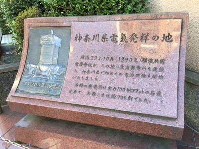 1890年(明治23年)、この地に火力発電所を建設し神奈川県で初めての電力供給を開始しました。当時の発電所は出力100キロワットの石炭火力で、お客様は約700軒だったといいます。碑には「エジソン式直流発電機」が描かれていました。