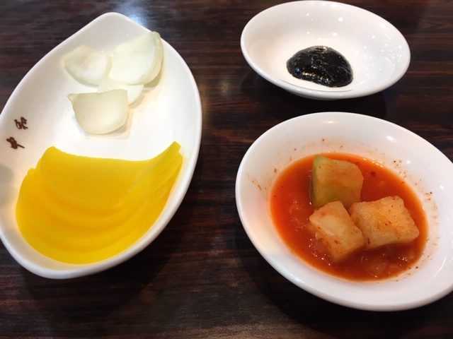 「チンミトンダク」というこの店は、このチキン通りでも一番の有名店らしい。注文したら、韓国チキンには定番の大根酢漬け、お菓子(あられみたいなつまみ)が来ます。