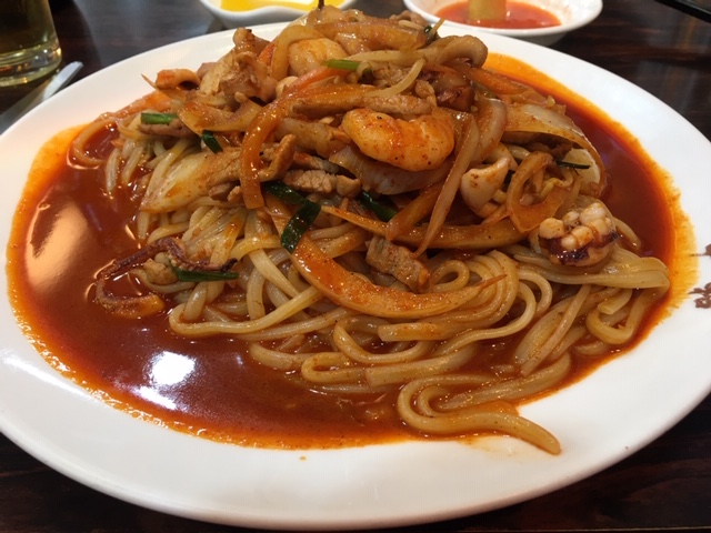 さてその味ですが、見た目より辛くなく、具沢山で、白菜、玉ねぎ、海老、イカ、豚肉などが入っており、ボリュームたっぷり。