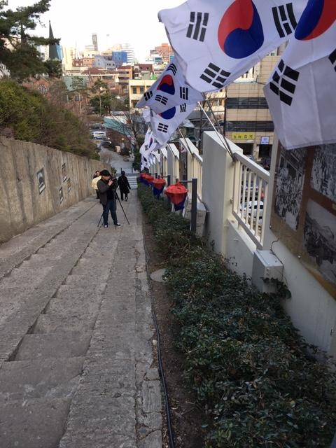 1919年3月8日午後、ソウルで起きた3.1運動が、大邱でも起き、この階段から運動がスタートしました。隣の第一教会新館は大邱の学生が日本警察を避けて身を隠した所だといいます。ケサン学校、シンミョン学校、ソンソ学堂、大邱高普などの、さまざまな学生が、ここを通って3.1運動集合地へと行進しました。