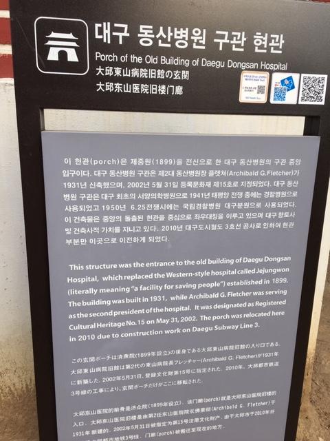 東山病院は、朝鮮末期の「済衆院」(チェジュンウォン。現在の国立病院)の後身で、この玄関ポーチは、1931年に新築された大邱東山病院旧館にあったもので、登録文化財第15号。