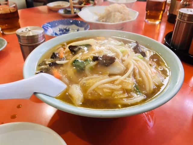 いわゆる町の中華屋さんです。お昼時でしたが、ビール工場での試飲の余韻で痛飲しました。野菜炒め、餃子、ソース焼きそば、ニレレバ、サンマーメン(もやしそば)、炒飯とどれを食べても美味い。